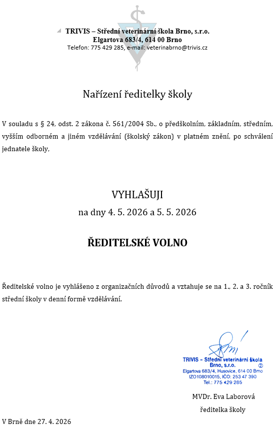 Adresa: TRIVIS - Střední veterinární škola Brno, s.r.o., Elgartova 683/4, 614 00 Brno Telefon: v kontaktech